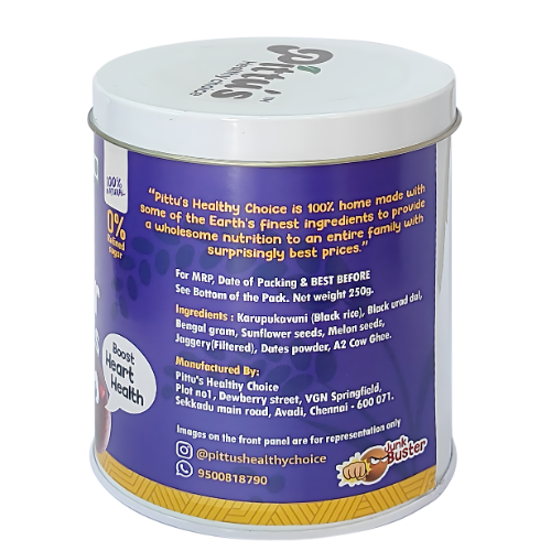 Pittu’s Black Rice (Karuppu Kavuni) Power Balls (250g) are a wholesome, ready-to-eat snack made from traditional black rice, lentils, seeds, jaggery, dates powder, and A2 cow ghee. Naturally rich in iron and antioxidants, these nutrient-dense bites provide sustained energy without refined sugar or artificial additives. A healthy and convenient snack option crafted for the entire family.