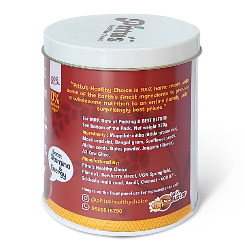 Pittu’s Mappillai Samba (Bride Groom Rice) Power Balls (250g) are a traditional, nutrient-rich snack made from authentic Mappillai Samba rice, lentils, seeds, jaggery, dates powder, and A2 cow ghee. Naturally rich in iron and energy-supporting nutrients, these ready-to-eat bites provide sustained stamina without refined sugar or artificial additives making them a wholesome snack for the entire family.